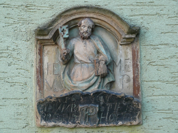 Mindestens 15 verschiedene Klöster, Abteien und weltliche Grundherren waren bis zur französischen Revolution in Klüsserath begütert, d.h. sie besaßen hier Felder, Wiesen, Grundstücke und vor allem Weinberge. Zur Organisation dieses Besitzes vor Ort unterhielt jeder Grundherr ein Hofgut, das wie der erhaltene Echternacher Hof am Ostende des Dorfes meist nur aus einem Wohngebäude für den Meier – das war die Berufsbezeichnung der Gutsverwalter – und den nötigen Lagerraum für die landwirtschaftlichen Erzeugnisse umfasste. Der hier in ein jüngeres Wohnhaus eingesetzte Wappenstein mit der Figur des Heiligen Petrus gehörte als Hauszeichen zum heute verschwundenen Hofgut des Trierer Domkapitels. Die entsprechende Inschrift Thumb Stiffts Praesent Hoff weist mit der Jahreszahl 1661 darauf hin, dass das Gebäude damals zumindest grundlegend modernisiert und mit dem neuen, besitzanzeigenden Wappen geschmückt wurde. Möglicherweise geht damit auch die Bezeichnung dieses Abschnittes der langgezogenen Klüsserather Hauptstraße als Fronhof (Herrenhof) auf das ehemalige Hofgut des Domkapitels zurück, das zumindest bis ins 19. Jahrhundert an dieser Stelle oder ganz in der Nähe gestanden haben dürfte.